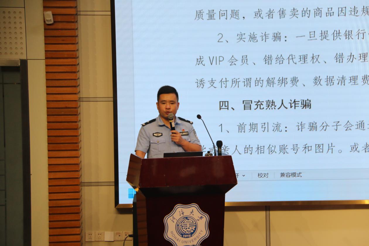 为切实筑牢校园安全防线,9月20日上午,河海大学水利水电学院邀请江宁开发区派出所曹警官在江宁会议中心二楼,为2025级新生举办了一场反诈专题讲座,由2025级本科生辅导员侯开智主持,352名2025级全体新生参加。