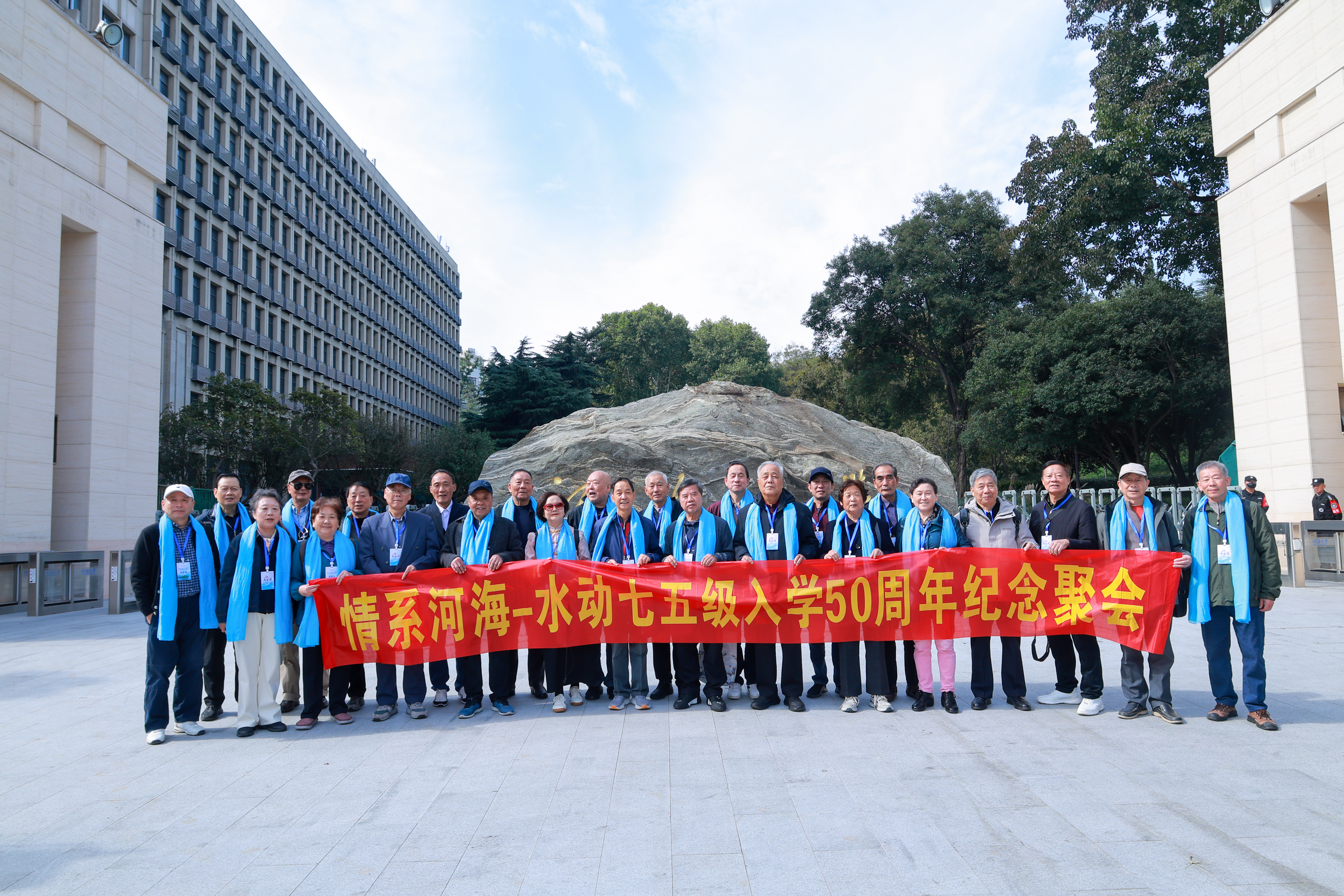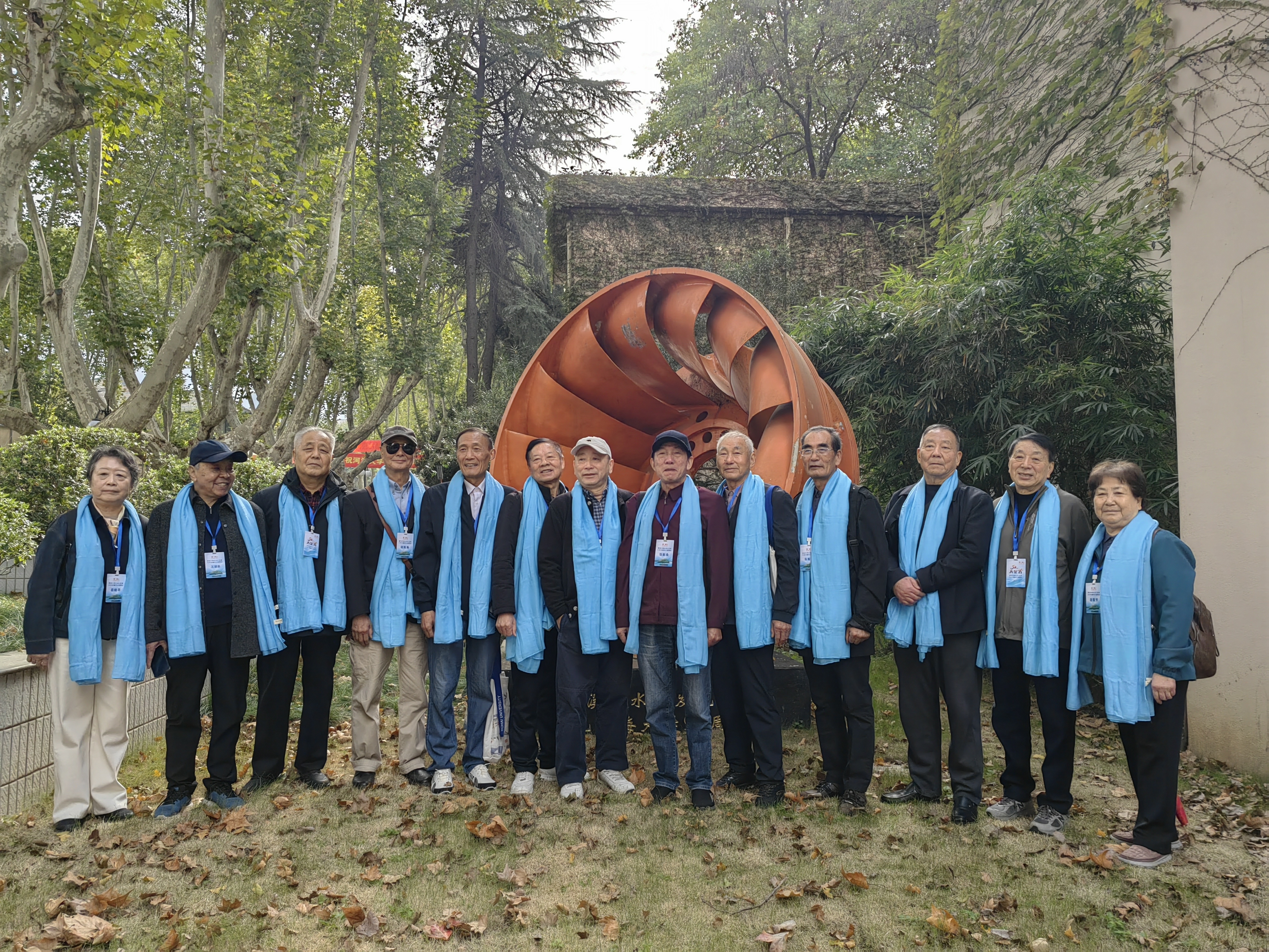 11月4日上午,75级校友们聚在河海大学西康路1号门前,他们人人佩戴一条“河海蓝”围巾,与母校合影留念。校友们在熟悉的校园里徜徉,回忆着学生时代的一点一滴,追随着记忆,流连在水电学院门前。在那个矗立着的、硕大水轮机转轮前,同学们动情地抚摸着它,深情回忆着老师当年上课的模样,也讲述着毕业后各自在水利行业工作的往事,他们中有水利局长、总工、技术总监、教授,有的退休多年仍被返聘,巡察巡检,传帮带,“毋负邦人期”。校友们盛情邀请水电学院两位年轻的当家人合影,畅叙,祝愿水电学院再创辉煌。