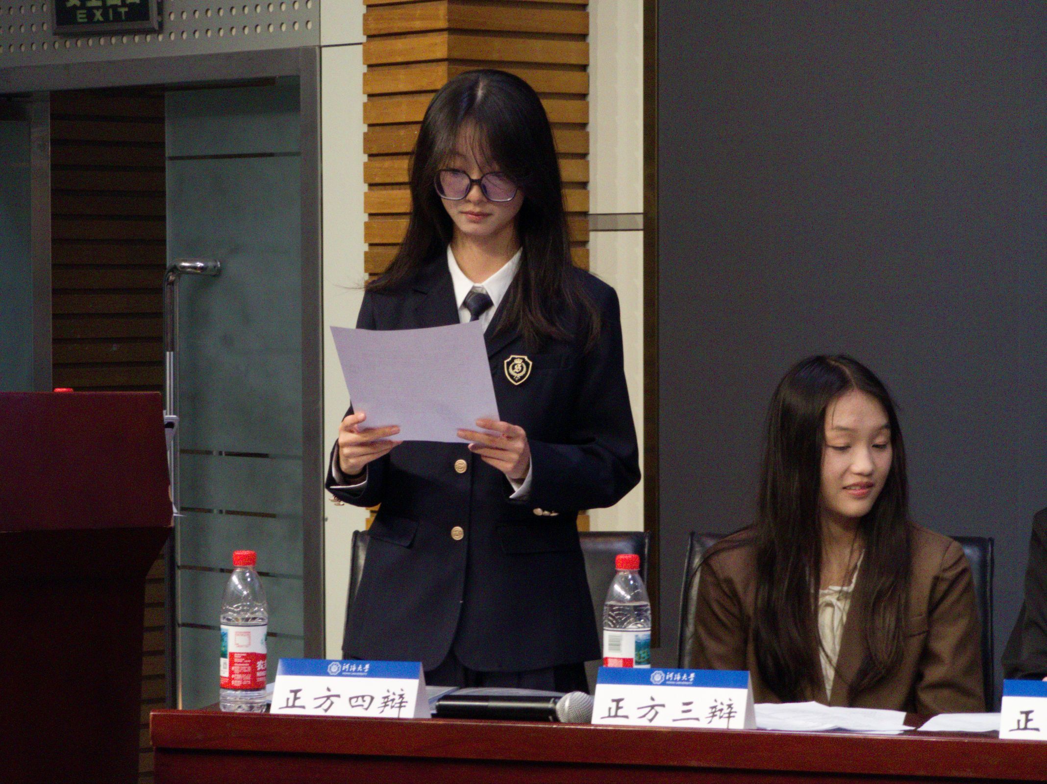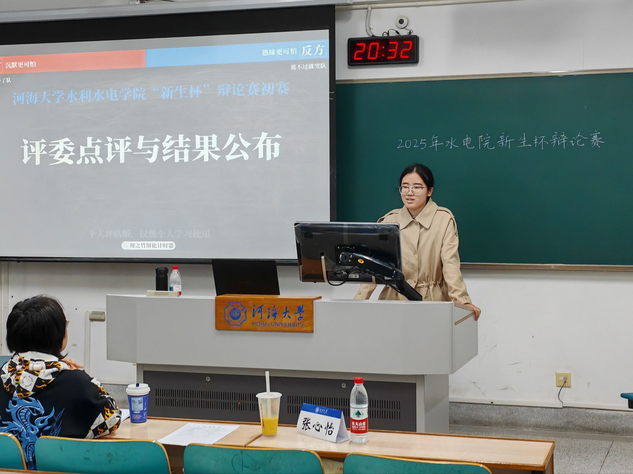 本次辩论赛决赛的专业评审团,由河海大学校辩论队22级许峻晞学长、水利水电学院辩论队24级李雪安琪学姐、谭郝学长组成。三位评委全程细致观察赛场交锋,精准捕捉辩手的逻辑亮点与表达巧思。赛后,评委针对双方辩手的辩论思路和技巧进行了细致点评,一针见血地指出了双方辩论中存在的问题以及更优的解法,同时也对他们的精彩表现予以鼓励。经过评委们慎重考虑,最终反方凭借更严谨的逻辑架构与默契的团队协作脱颖而出,摘得桂冠;正方四辩陈怡希同学以敏锐的临场反应、犀利的质询话术与深刻的价值阐释,获评“最佳辩手”。