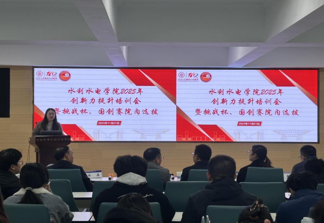 为进一步营造学院创新创业氛围,提升学生创新创业实践能力,11月21日,我院举办创新力提升培训暨第十五届“挑战杯”中国大学生创业计划竞赛院内选拔赛。双创学院副院长、校团委副书记房阔、水利水电学院副院长俞晓东、党委副书记戴媛媛、水利水电工程系主任徐磊、商学院袁猛出席并担任评委,学院创新创业导师代表、项目指导老师、备赛团队及团学组织骨干参加,活动由院团委书记笪步源主持。