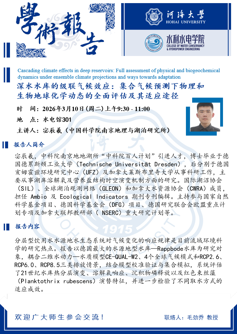 学术报告 | 深水水库的级联气候效应:集合气候预测下物理和 生物地球化学动态的全面评估及其适应途径